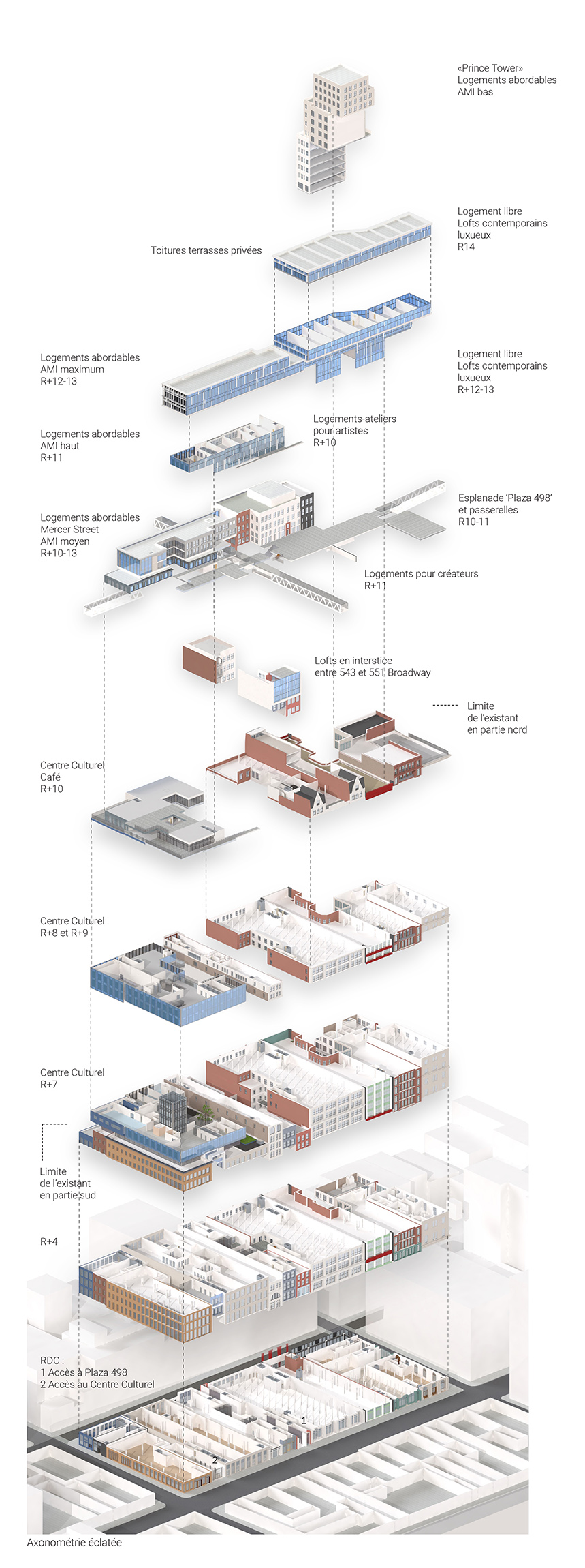 Axonométrie de l'insertion du projet en surélevation dans le socle existant irrégulier :